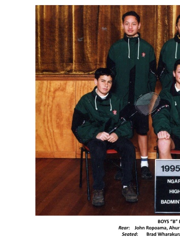 BOYS “B” BADMINTON, 1995 Rear: John Ropoama, Ahuru Blegum, Edward Meredith [Coach]. Seated: Brad Wharakura, Marrin Haggie, Motuhake Simon.